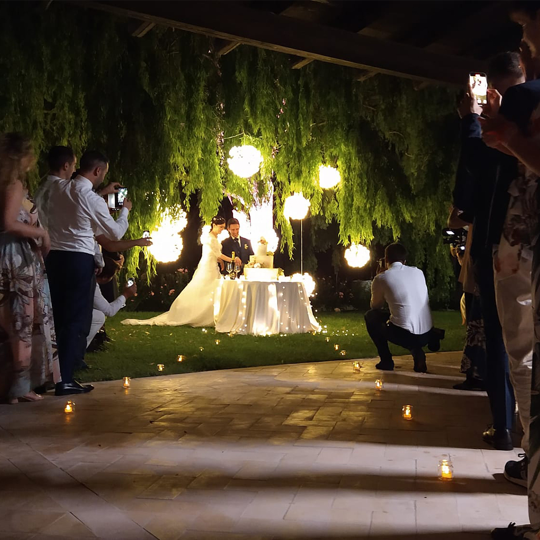 Set da 10 sfere luminose appese, a microled bianco caldo, ideali per taglio torta matrimonio e ambientazioni buffet per eventi