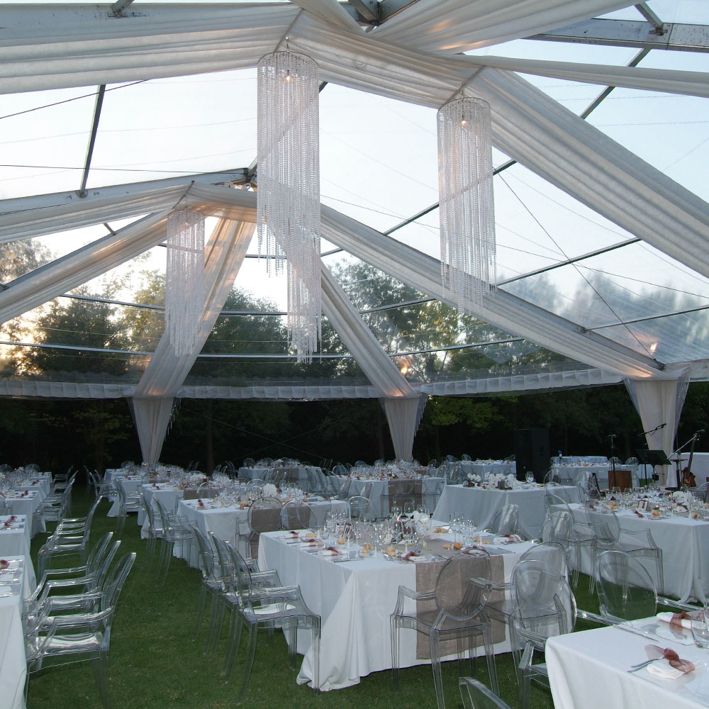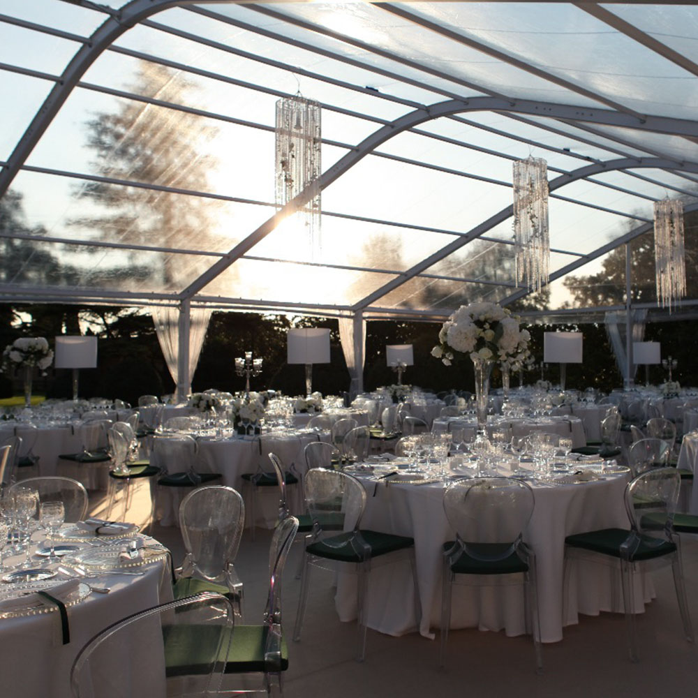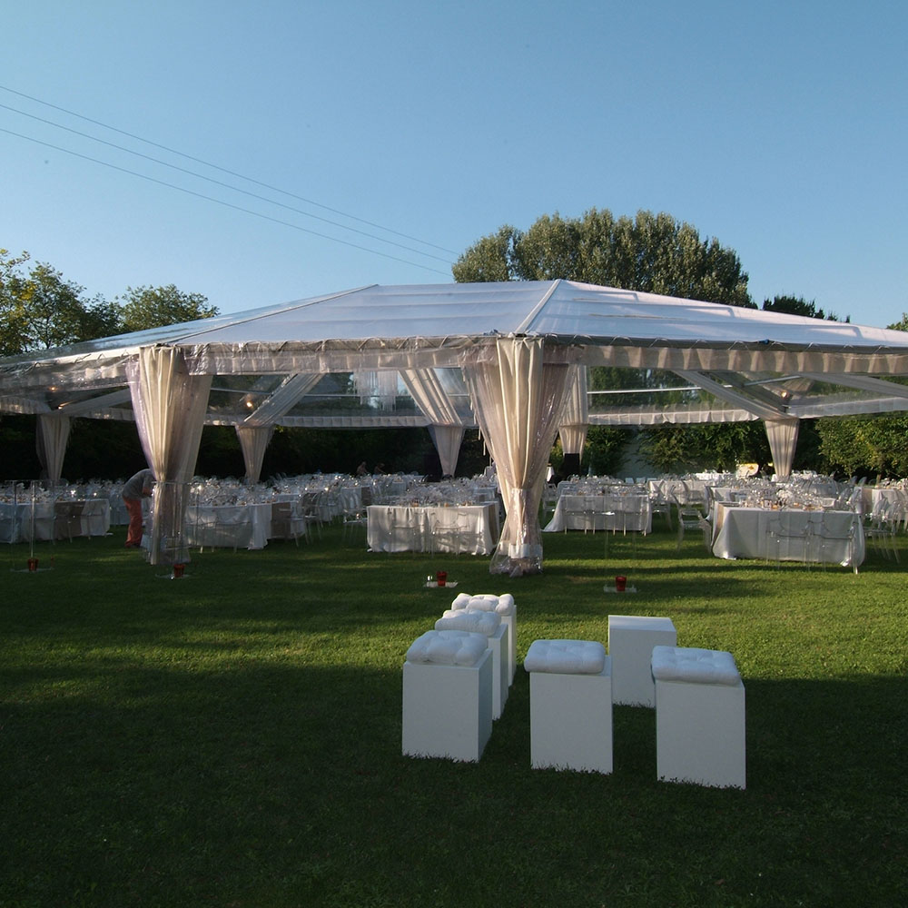Tensostruttura per allestimenti esterni in varie tipologie e misure, realizzabile in pvc bianco o crystal.